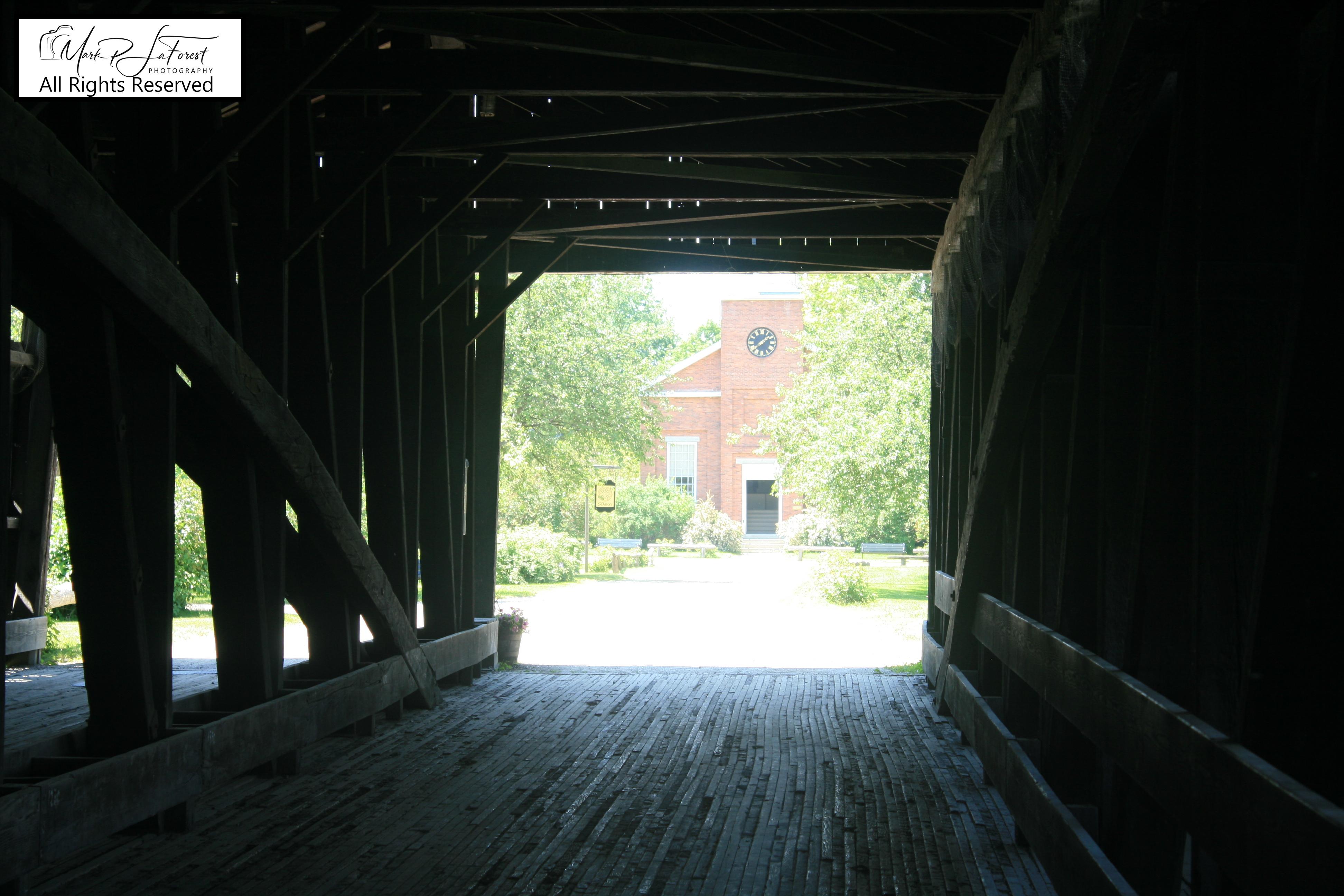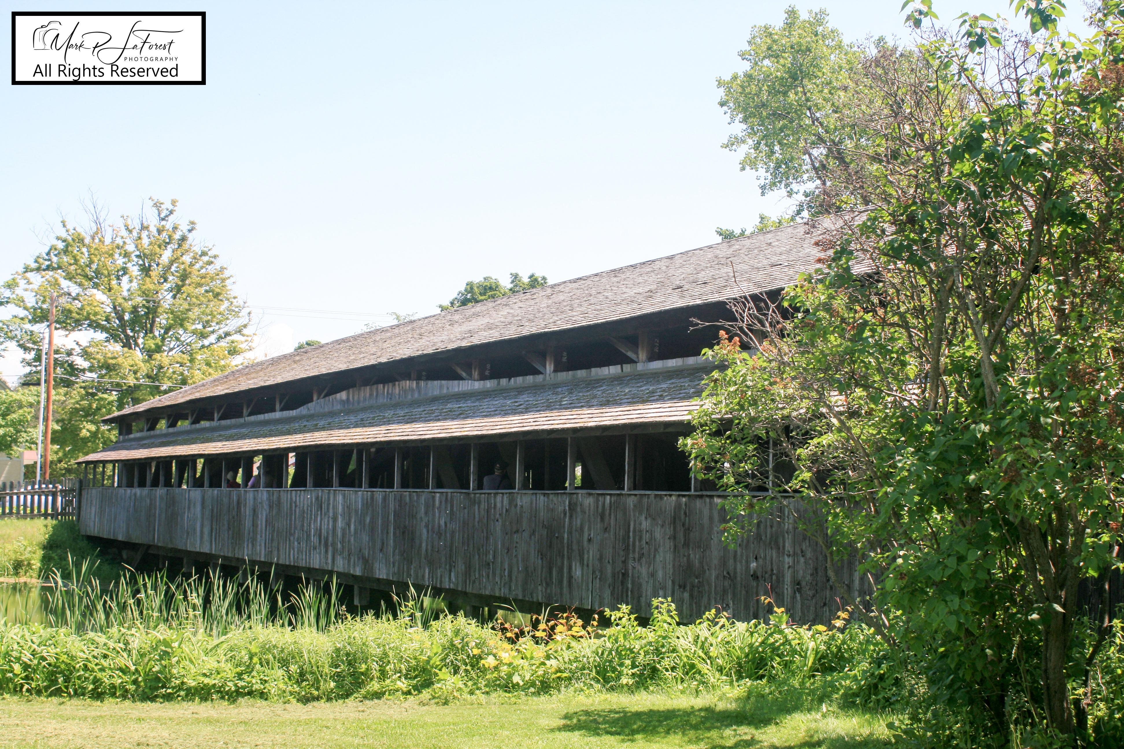 Built in 1845, the Museum Covered Bridge originally spanned the Lamoille River in Cambridge, Vermont. The trusses for the double bridge were assembled in a field next to the chosen site. Measuring 168 feet (51 m) in length, with two vehicle lanes and a footpath (attached after its original construction), it is an impressive example of the engineering principles and bridge-builder's craft practiced during the 19th century. The bridge was lighted by kerosene lamps.