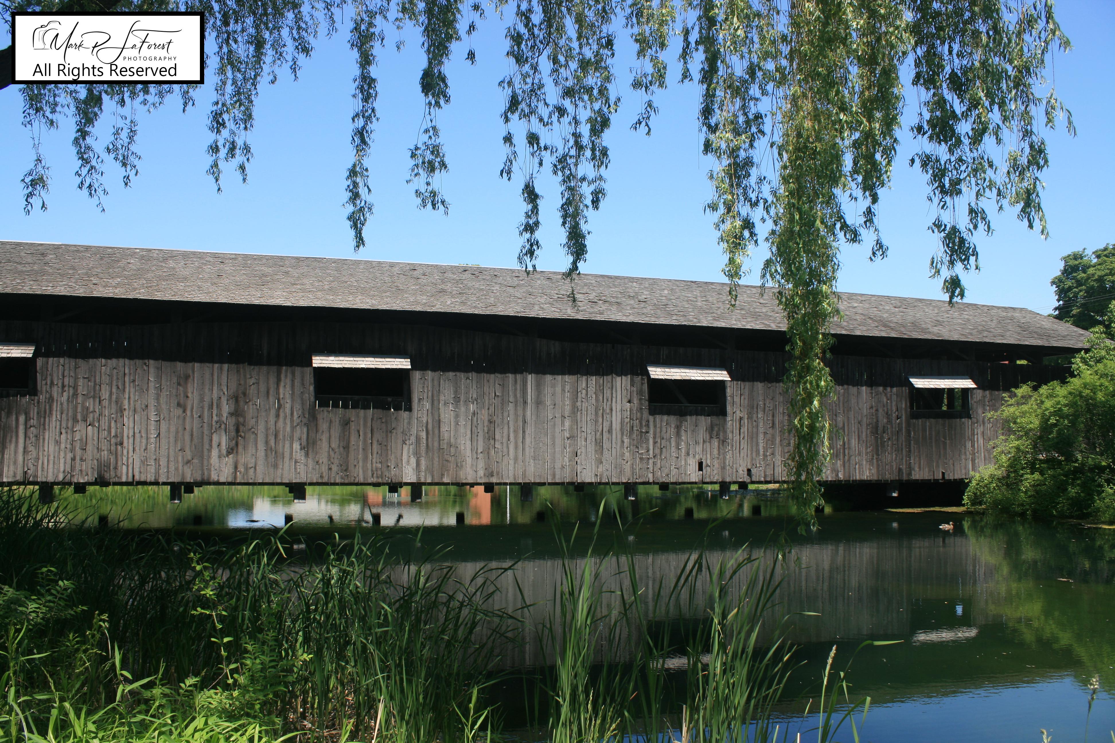 The museum dismantled the Covered Bridge in 1949 and moved it to the museum grounds. The beams still bear the identifying numbers for reconstruction. By situating it above a man-made pond, extensive landscaping integrated the bridge into the grounds. The Covered Bridge served for many years as the museum's entrance, but when automobile traffic proved too taxing, the museum relocated the entrance and retired the bridge from duty.