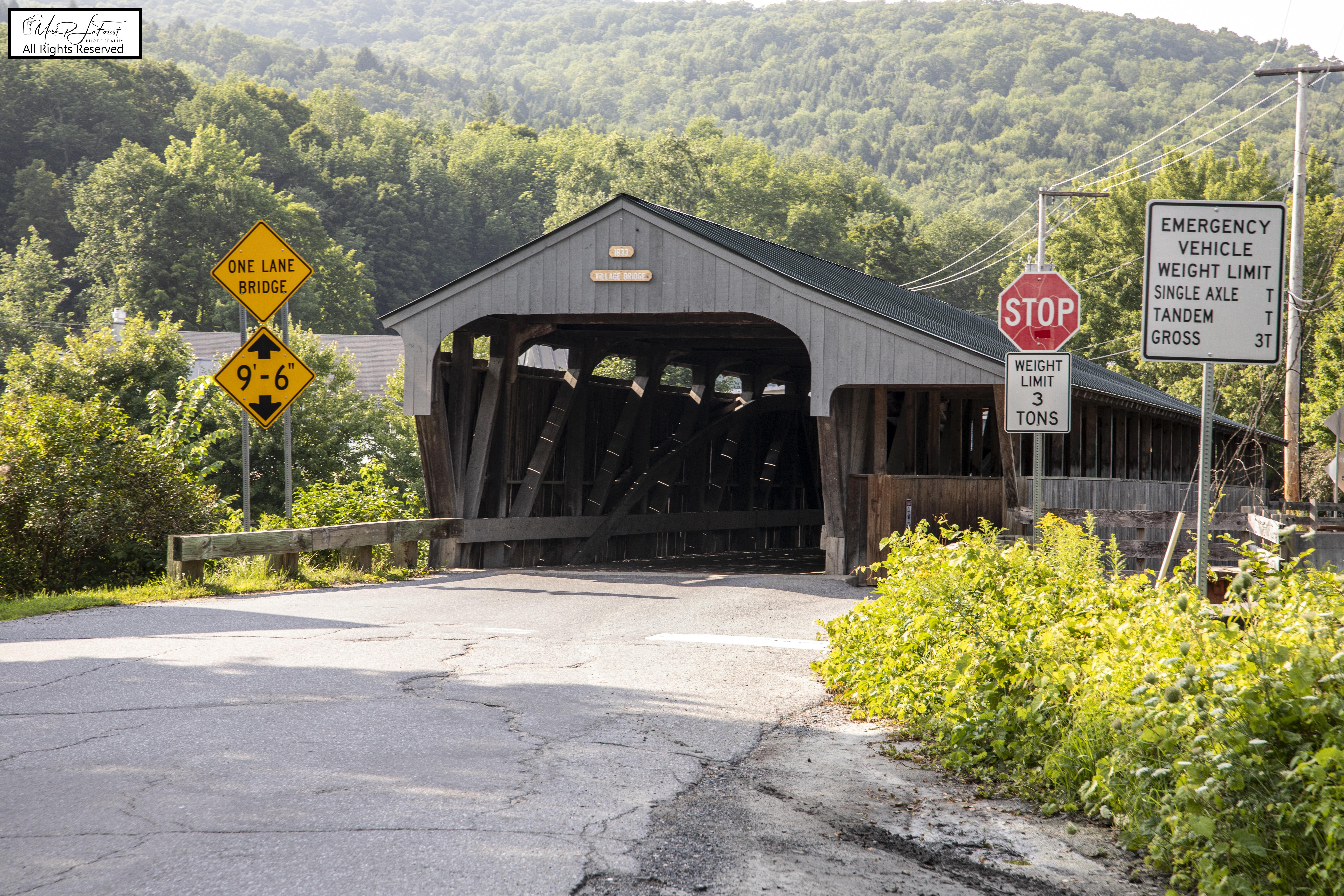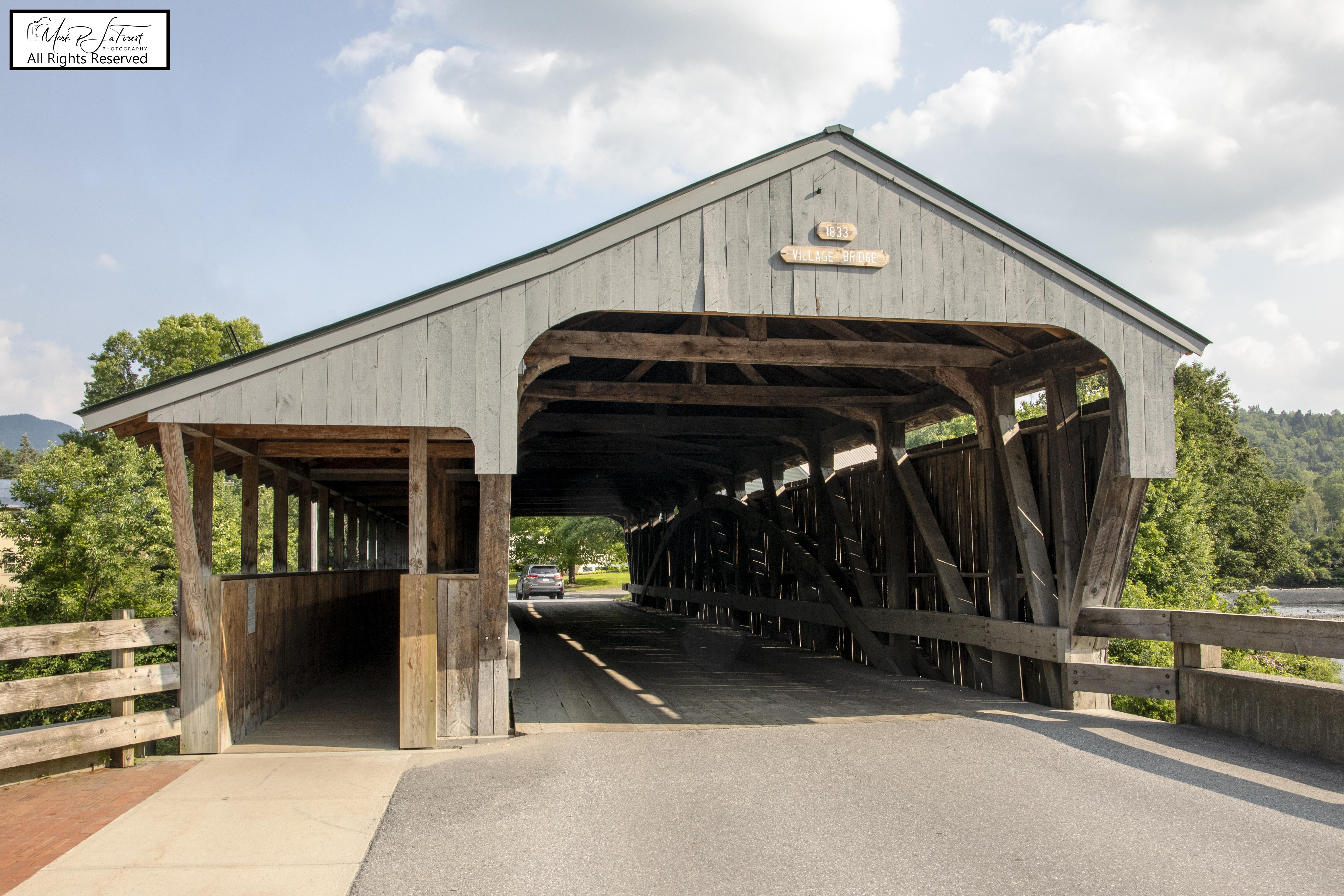 The Great Eddy Covered Bridge stands just east of Waitsfield's center, spanning the Mad River in a roughly north-south orientation. It is a single-span Burr truss structure, 105 feet (32 m) in length. Each truss incorporates a laminated arch, and laminated stringers have been added underneath the deck for added strength. The bridge is covered by a metal roof, which extends on the east side over a walkway on the outside of the eastern truss. The bridge was built in 1833 and is at least the second-oldest covered bridge (after only the Pulp Mill Covered Bridge, which may have been built at a later date). It is also the state's longest single-span Burr truss bridge. -- Source Wikipedia