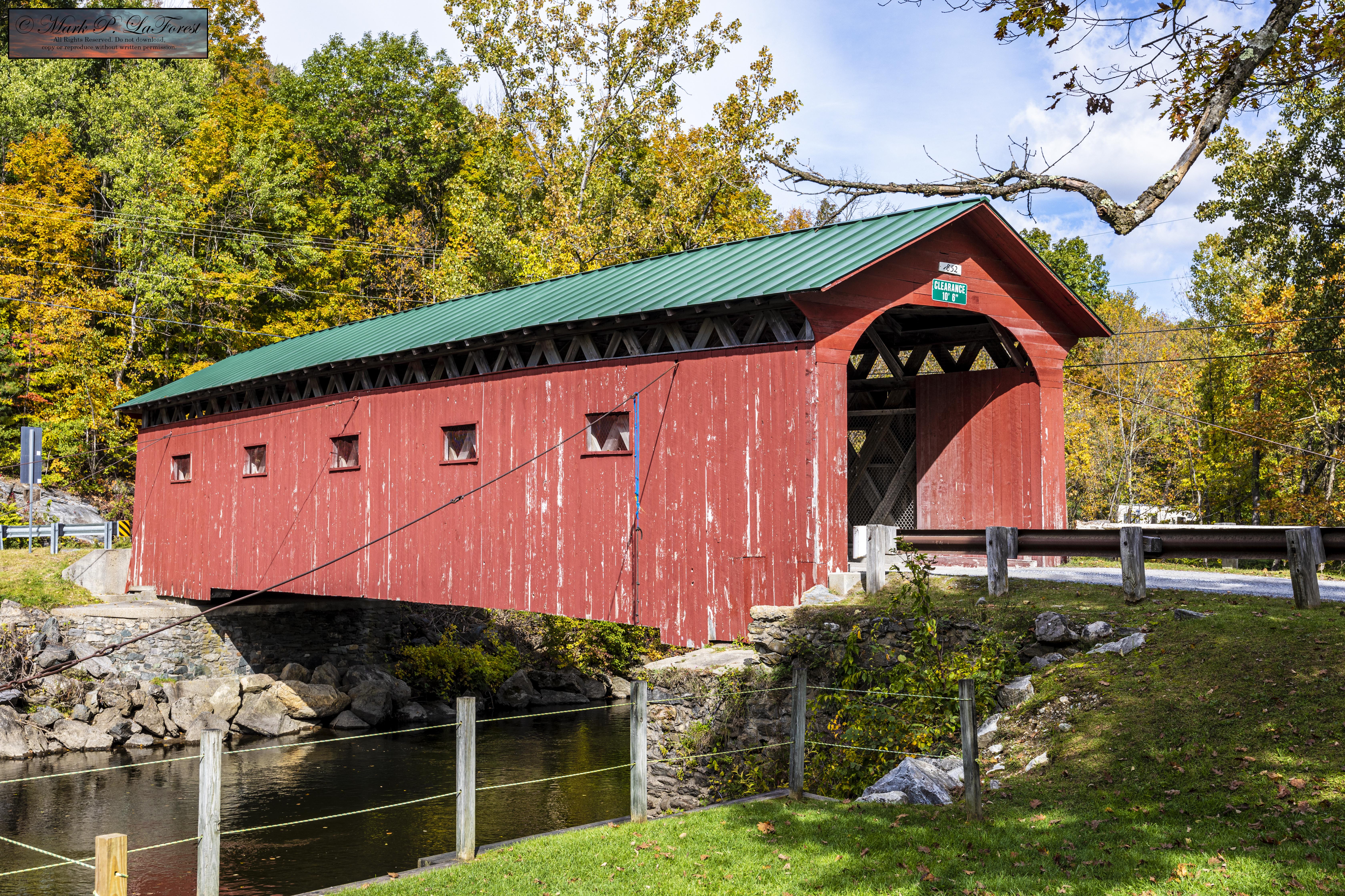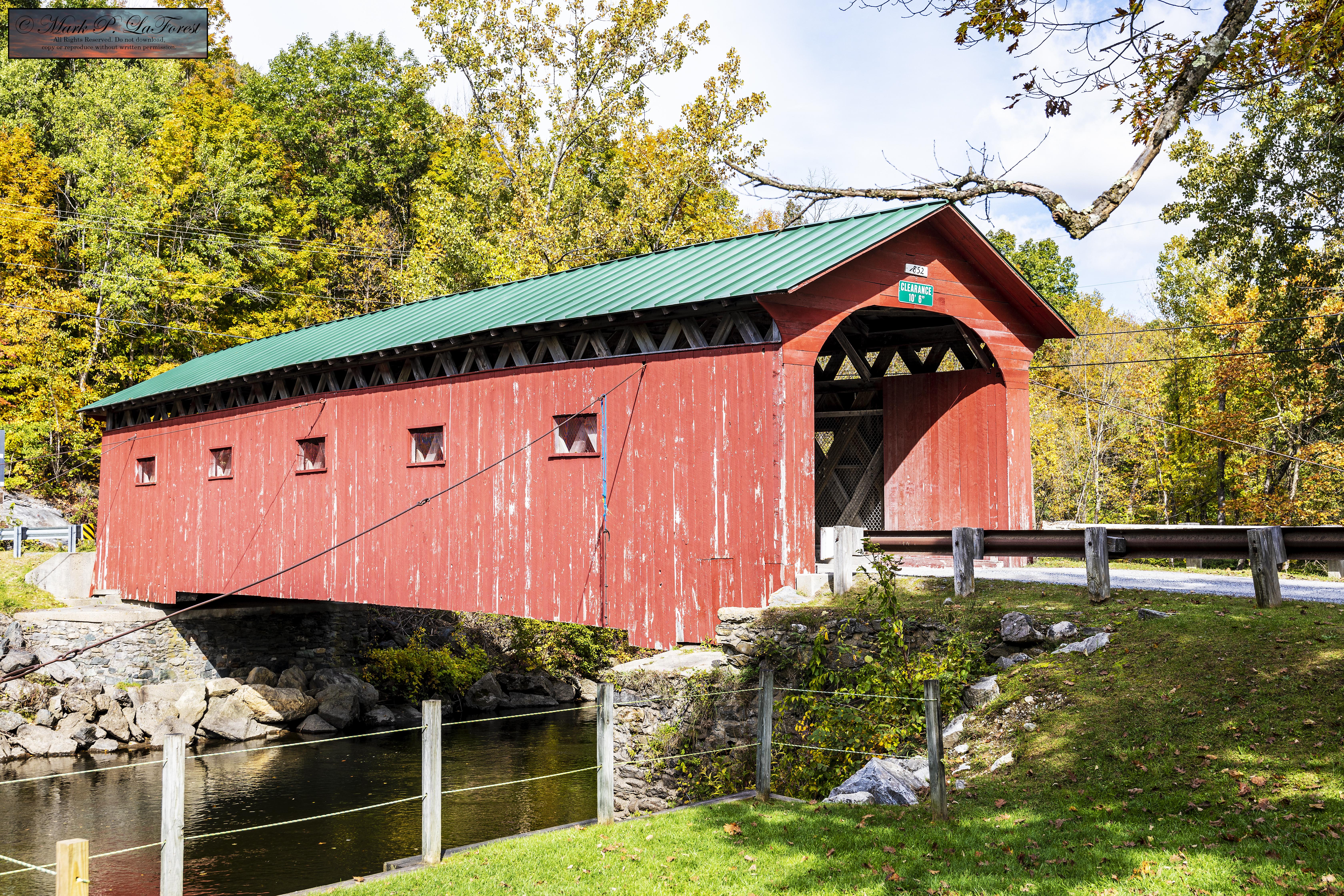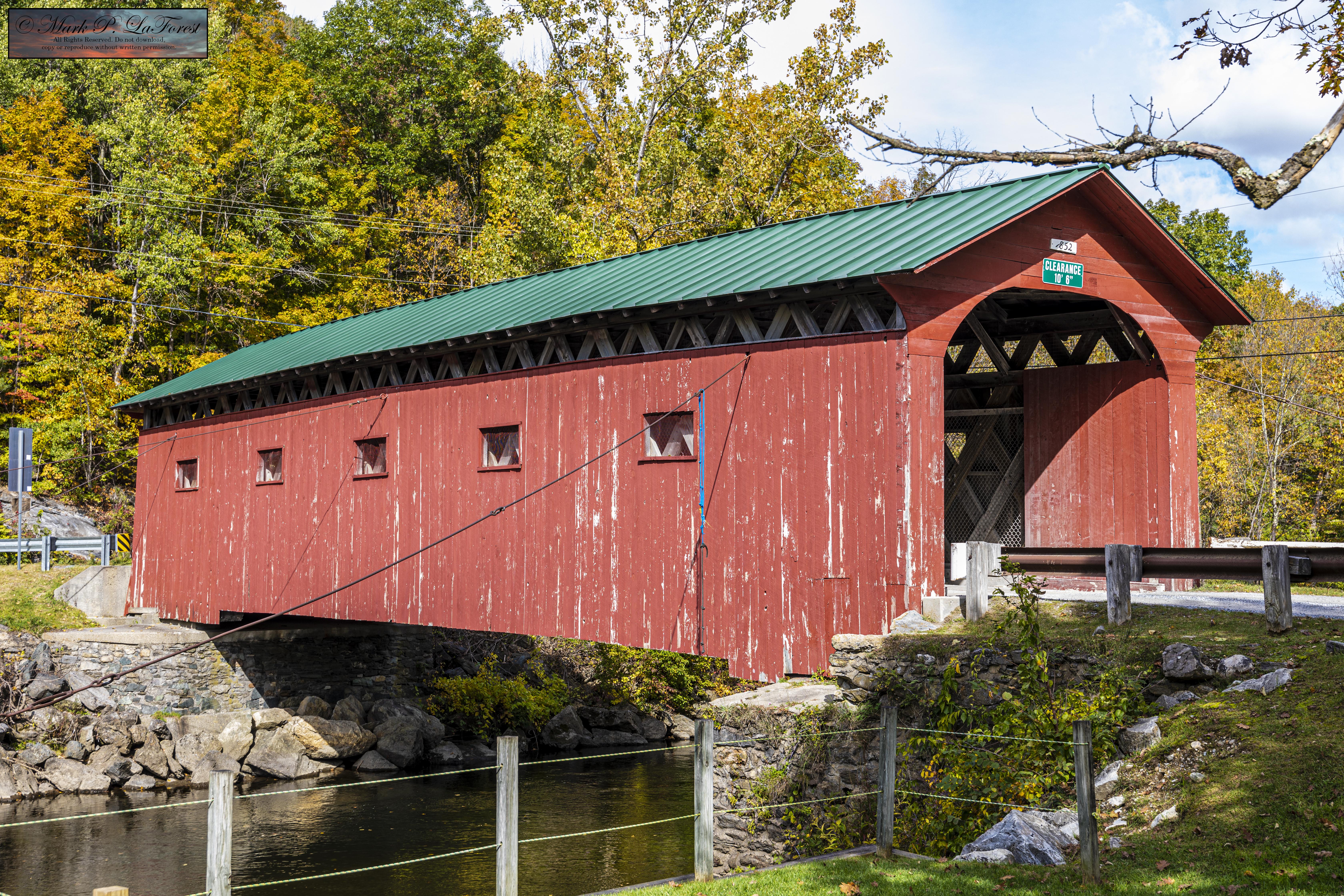 The bridge was built in 1852 and is one of the state's oldest surviving covered bridges. It is also unusual in that it has not had any 20th-century strengthening elements added, a common feature to many of the state's older bridges. On August 28, 2011, the Arlington Green Covered Bridge was damaged by flooding caused by Hurricane Irene; it was fixed in the following months and reopened to traffic. -- Source Wikipedia