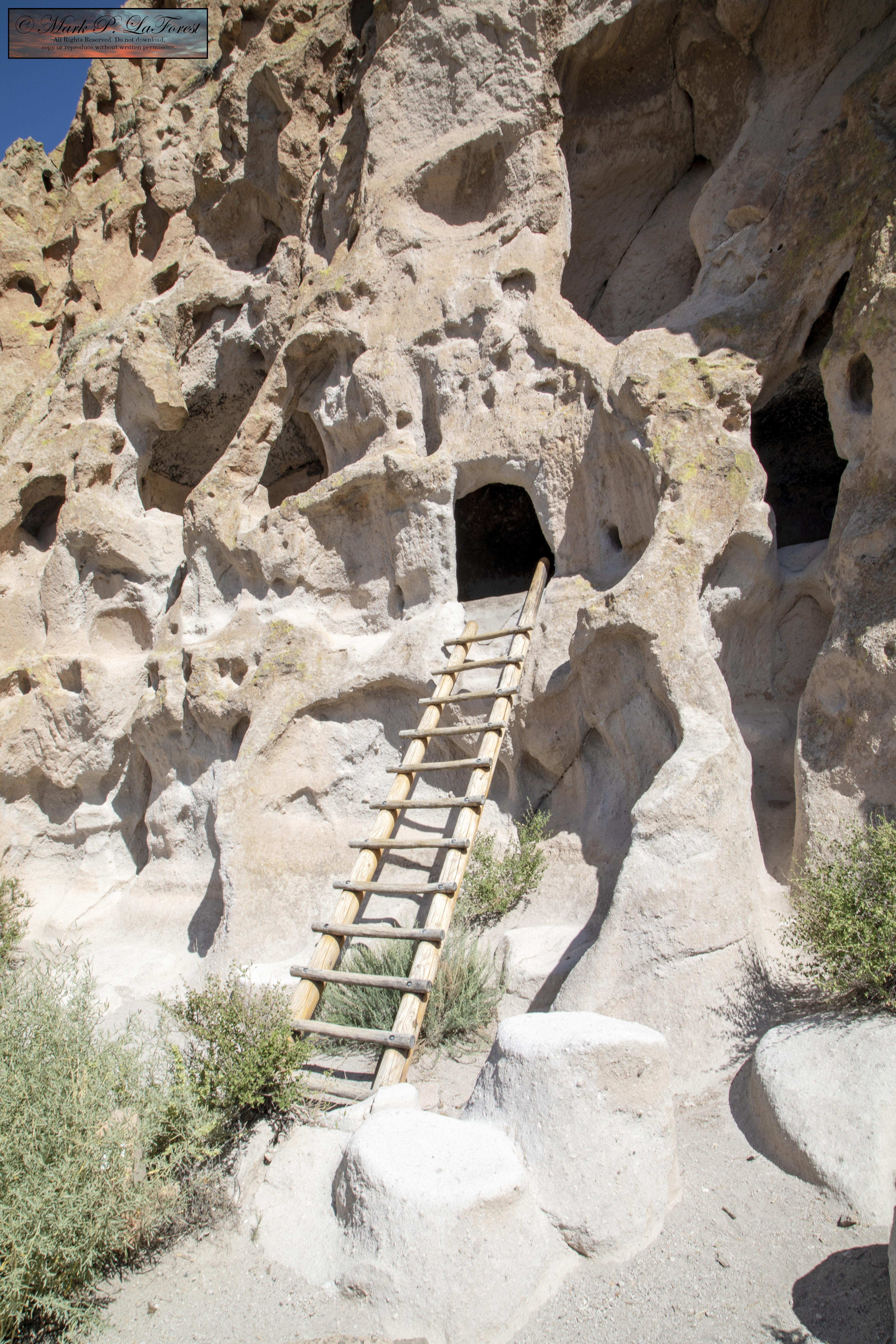 The Ancestral Puebloans carved dwellings into the soft volcanic tuff cliffs and used ladders to access them.